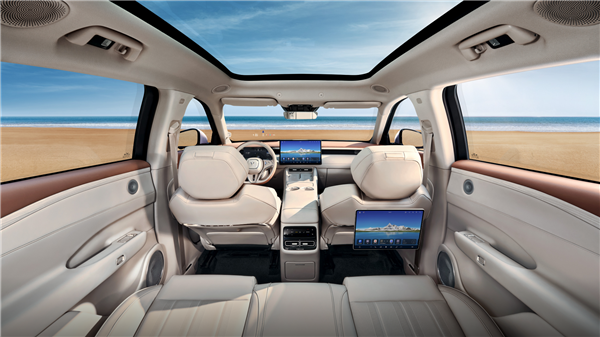 配置非常丰富,全系标配29英寸AR-HUD、女王副驾(通风+加热+按摩)、云朵后排(通风+加热,129°半躺)、22扬声器音响、7升双侧开门冷暖箱(-6-50℃,支持紫外线杀菌)。